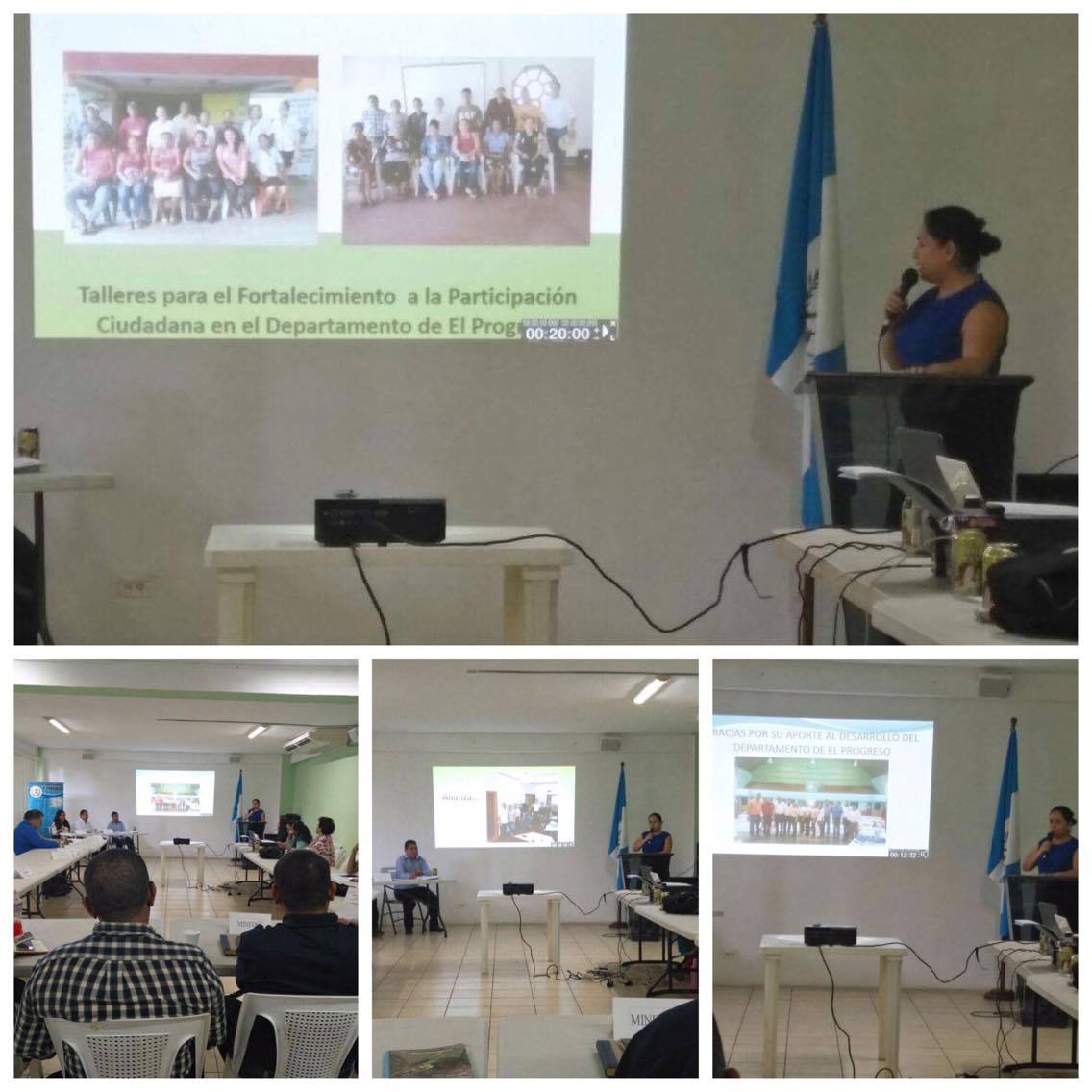 La reunión fue presidida por el señor Oscar Giovani Rodriguez Calderon, con el objetivo de presentar información de resultados y clausura del Taller "Fortalecimiento a la Participación Ciudadana del Departamento de El Progreso", actividad que se realizó a través de la coordinación del Promotor Social en el Departamento de El Progreso, para conocimiento de las acciones ante el Codede y logro de los objetivos del Consejo Regional de Desarrollo Urbano y Rural Región Nororiente.